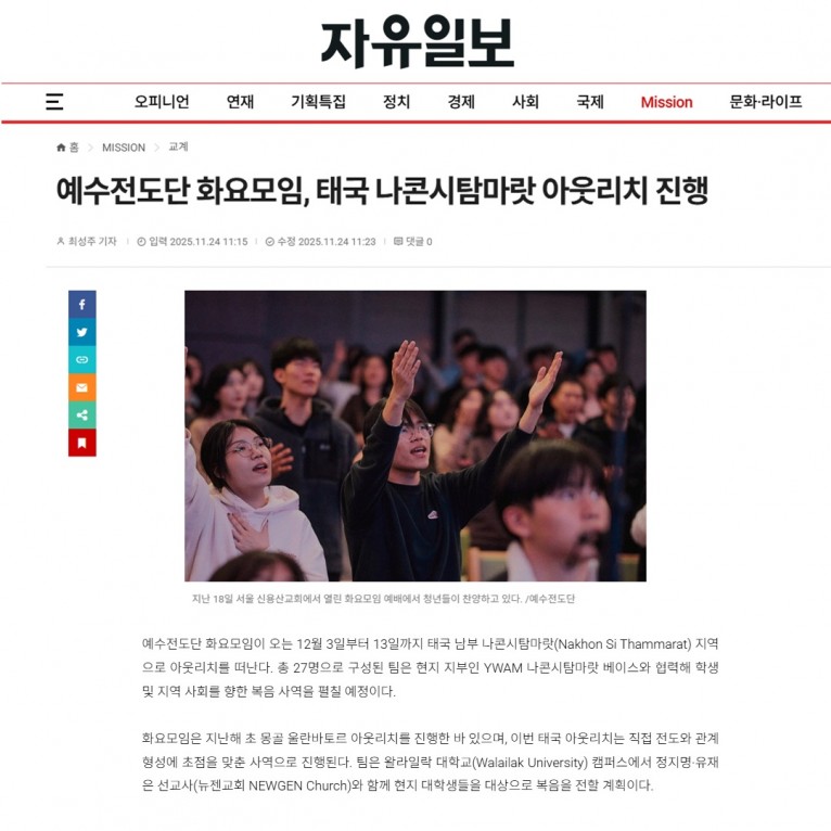 뮤직타임 [기사] 예수전도단 화요모임, 태국 나콘시탐마랏 아웃리치 진행(자유일보)