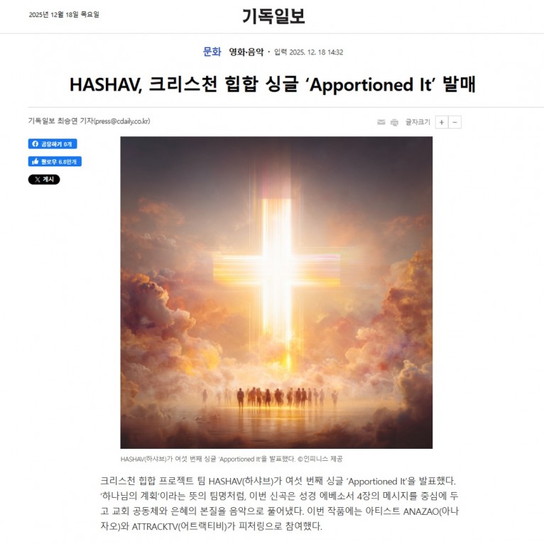 [기사] HASHAV, 크리스천 힙합 싱글 ‘Apportioned It’ 발매(기독일보)